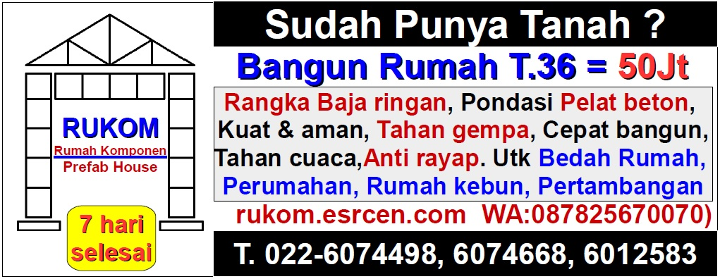 Download: Brochure Rukom TechSpec Rukom Prefab Building Research Centre (PBRC)PBRC didirikan pada tahun 2015 untuk melakukan penelitian dan pengembangan dalam bidang teknologi bangunan prefabrikasi dan modular. Bangunan dengan teknologi prefabrikasi dan modular akan menjadi kebutuhan di masa depan, dimana kebutuhan akan pembangunan yang cepat dan praktis akan diperlukan untuk mengimbangi pertumbuhan penduduk dunia yang kian cepat dan keterbatasan lahan yang ada. Prefab House TechnologyPerkembangan penduduk dunia membutuhkan solusi pembangunan rumah yang kuat, aman, mudah dibangun dan ekonomis. Setelah melakukan berbagai percobaan, PBRC mengembangkan sistem rumah praktis berdasarkan komponen, yang dinamakan RUKOM atau RU-mah KOM-ponen. Dengan teknologi ini maka satu rumah dapat diselesaikan dalam beberapa hari saja.